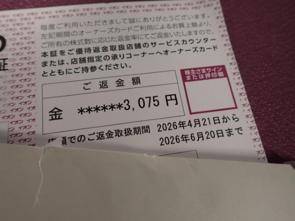 【株主優待】イオン(8267)の第81回株主優待返金引換証到着!電子化推奨の圧が強い! 公開日:2026年4月18日 株主優待2月 イオンの81回(2025年9月~2026年2月)半期分のオーナーズカード返金額が確定しました。今回は3,075円でした。こちらは年配の両親に使って貰っていて、買い物とかどんな感じなのか見守りにも使えます。 ⇒イオン(82 […] 続きを読む