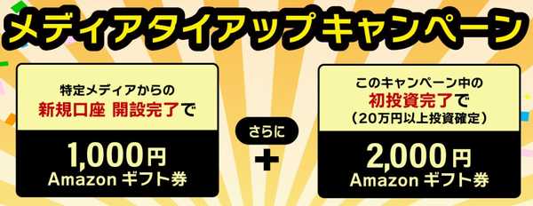 新規口座開設時に招待コード「CAPIMA2305」を入力することで開設完了で1,000円プレゼント。さらに投資完了で2,000円分プレゼントなど。2026年1月末まで。毎月、継続が続いているもののいつ終わるかは不明。おもてでは紹介しておらず、紹介サイトを経由し紹介コードを入力した人だけ適用なので注意。