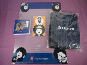当方は4桁揃いで、「らいおん料理長マグネットクリップ(1個)+ 小林芳彦格言付箋(1個)+ オリジナルA4クリアファイル(1枚)+ LION FXオリジナルエコバッグ(1個)」という組み合わせです。