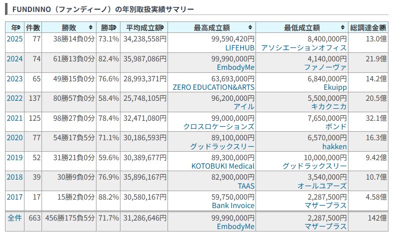 【株式投資型クラウドファンディングサマリー】年別、業者別の実績まとめ表示
