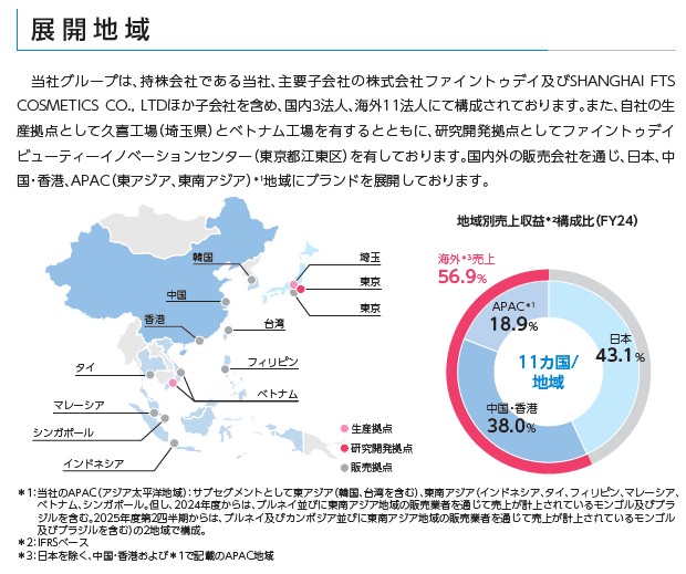 現在の売上構成比です。すでに海外売上のほうが割合が高い状況ですが、それでも国内売上が国別では1位です。中国や香港での熱も下がってきそうで、APAC地域の国へより注力して広がりを見せたいですね。韓国は韓国で独自の強みがあって、逆に日本で韓国コスメとか流行るレベルですので、今や資生堂の強みも弱まっているのでは?と思いますね。