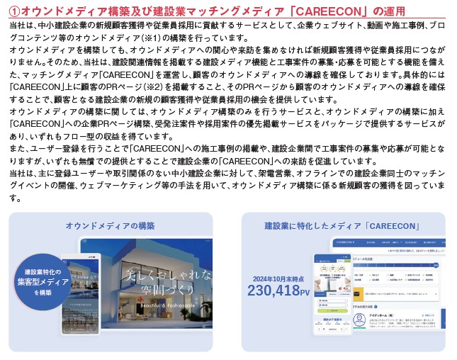 「CAREECON」は建設業に特化したオウンドメディアの構築をベースにPRサービスなどを展開しています。中小の建設業者の集客をITサービスでサポートといったところでしょう。大手の建設業者は住宅展示場への出店含め、様々な部分で集客ための資金を投入できますが、中小企業はそういった部分が苦手、そこに目をつけてネットの力で頑張ってきた会社と言えますね。個人的にはこういう姿勢でサービス展開している会社は好きなタイプです。