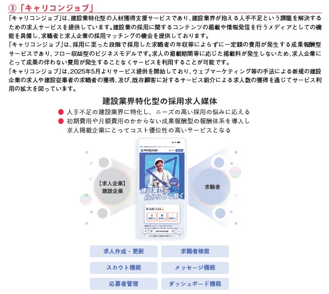 新サービスとして「キャリコンジョブ」というものがあります。こちらは人材獲得に特化した内容。どの分野もそうですが労働者不足が現在の各業種の悩みです。その中でも建設業の人手不足はかなり深刻のようで、需要の高まりに併せてサービスを作ったイメージですね。似たような人材獲得支援サービスはたくさんありますが、ここは建設業特化することで余計なものは省いて、必要なものに注力していそうです。