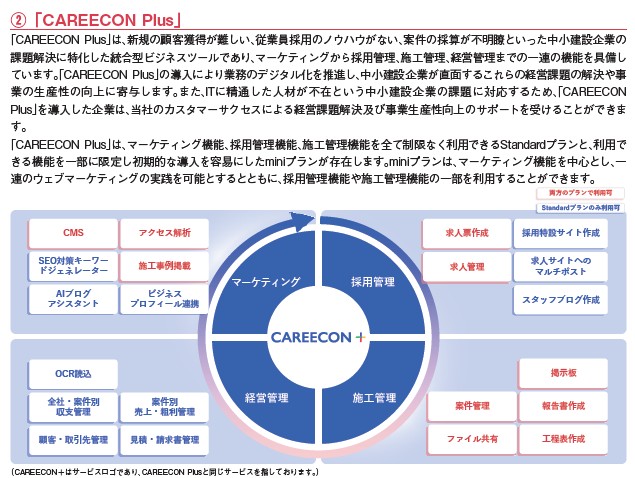 「CAREECONプラス」はさらに集客メディアだけでなく、実務面のDX化を推進するサービスです。経営管理、採用管理、施工管理まで含んでいますが、どうしてもデジタル化が苦手となる中小建設業者でしょうから、それらにフィッティングしたサービスを提供していそうですね。ミニプランを用意している事も考えると、やはり費用はかけにくいけどなんとかしたいという中小業者向けにサービスが作り込まれていそうです。