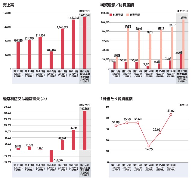 業績です。売上高はそこそこの成長。業績ぐらいとしてはきれいな形と言えそうです。2025年時点でも支店設立で全国へエリア拡大傾向ですので、まだ成長は見込めそうな雰囲気です。