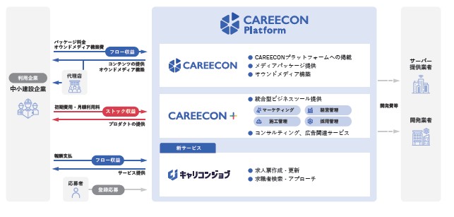 事業内容は主に中小の建築業者向けに3つのサービスを展開しています。「CAREECON」「CAREECONプラス」「キャリコンジョブ」の3つです。どういったものか、それぞれ紹介したいと思いますが、ここ会社は社名もそうですが、サービス名も造語が多いですね。