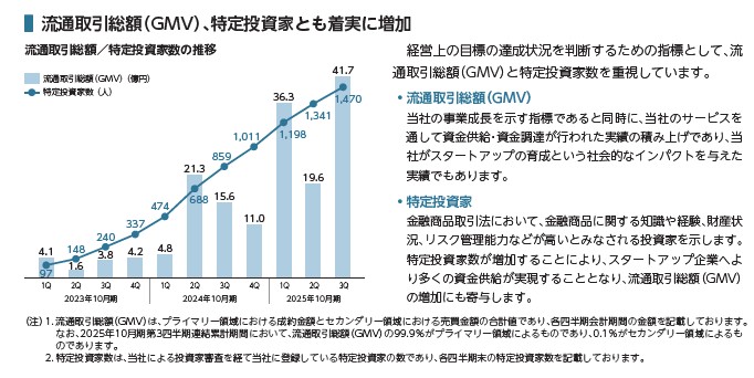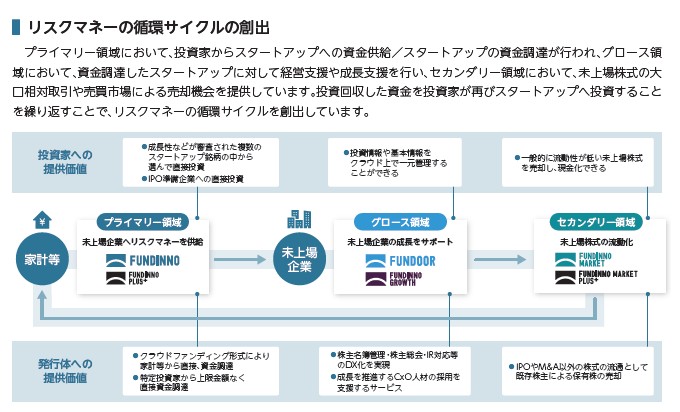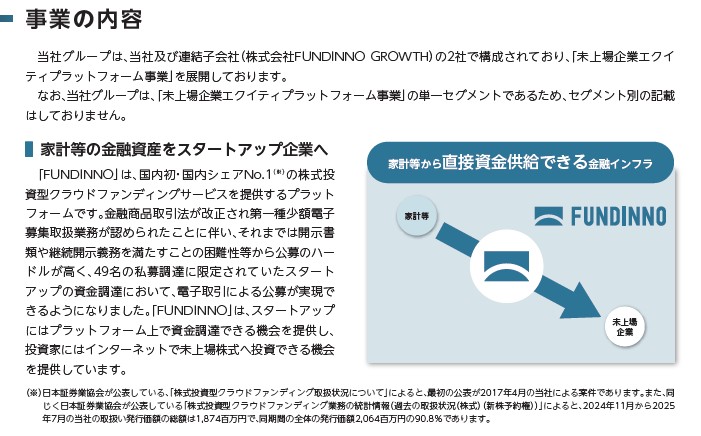 株式投資型クラウドファンディングのプラットフォームでは取扱量No.1です。またそれに付随した未上場企業のサポート業務もいくつか用意しています。議決権行使の電子化とか、未上場企業にとって便利なサービスも多いですね。
