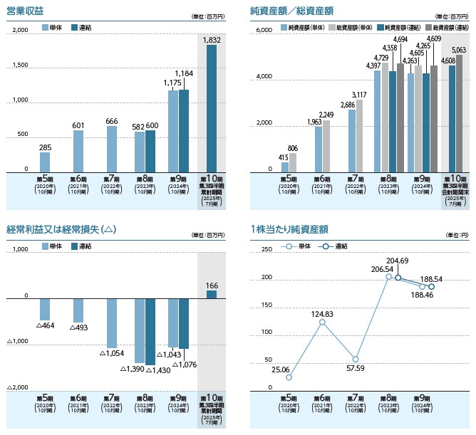 業績です。売上(営業収益)は10億超えのここ最近でようやくといったとこで、利益に関しては赤字が続いていました。黒字化してようやく上場ということですが、ダウンラウンド上場ですね。評価としては約半額ぐらいのダウンラウンドです。ストックオプションの1,000円というのが目安になるでしょう。