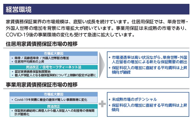 家賃保証サービス。単身で賃貸契約をする人が増えてきた頃から「家族などの連帯保証人→家賃保証会社」の流れになった。事業自体は食いっぱぐれがなさそうな雰囲気で、安定的に業績は推移しそう。