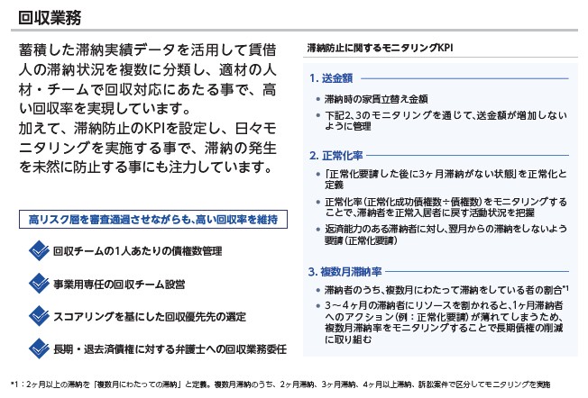 回収業務にも書かれています。「適材の人材・チームで回収」にあたるようです。ここの取り立て具合の程度は分かりませんが、高い回収率とだけ書いてますね。取り立て業務の実態は様々でしょう。昔、取り立て現場で、本当に賃貸ビルを複数人が張り込んでいて、住人が2階のベランダから逃げようとしてあえなく捕まっている修羅場など見たことあります(家賃滞納していて、住人が悪いという説明を受けていました)。