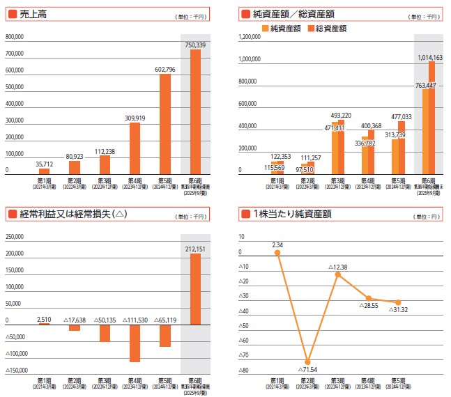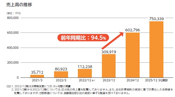 目論見書の最初の方に売上高の推移が載っています。成長の自信を感じますね。2023~2024年では約2倍の成長を見せており、同じような成長を続けているという成長力の高さが自慢です。