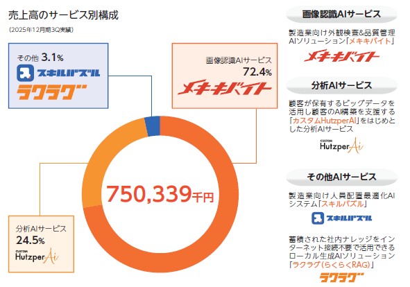 売上高の構成比率ですが4分の3をメキキバイトが占めています。他のサービスもAI活用で伸びそうですが、まだまだメキキバイトが多くの製造業界の現場で広がりを見せていく可能性があり、AI活用系の期待企業となっています。