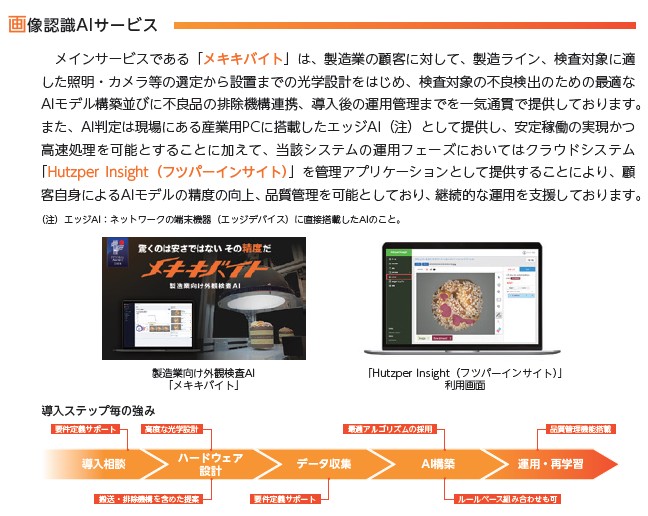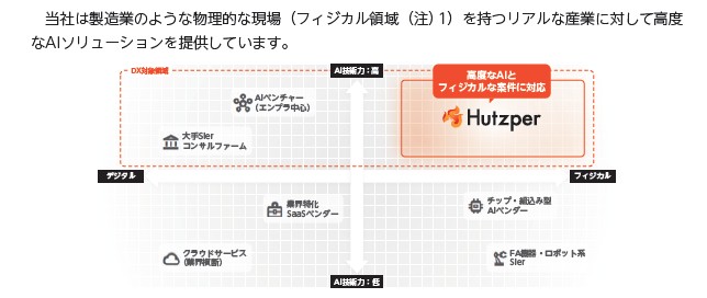 主に製造業向けのAI支援サービスを提供しています。外観検査自動化AIでライン作業の効率化、AI分析開発受託、人材配置AI支援などになります。フツパーはアルファベットでHutzper。ヘブライ語のようで「大胆な野心」って感じですね。ロゴが炎で熱いです!