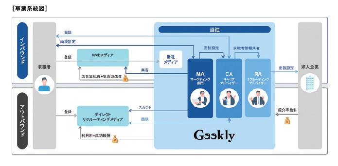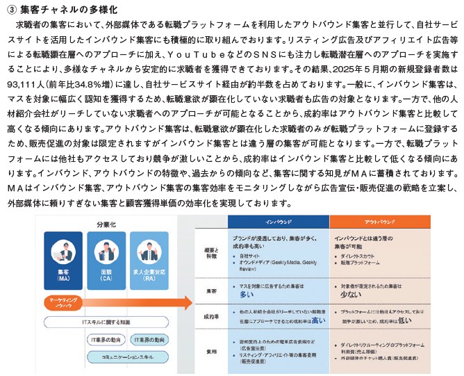 事業内容です。事業系統図を見ると「インバウンド」「アウトバウンド」と2系統の集客があります。特にギーキーな人材紹介に特化していることから、他社のようなアウトバウンドだけでなくインバウンドで「業界の痒いところをついた」集客をしていそうですね。