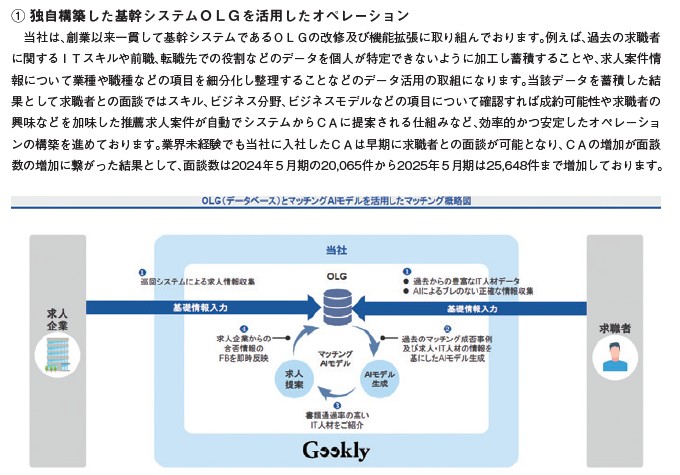 1つ目は独自のモデルと活用したマッチングオペレーションです。面白いのが、求職者の人材データを個人情報をバレないように加工して、細分化したマッチングモデルを作っているようです。システム屋さんには影の実力者みたいな人は多いですが、表に立つのが苦手、身バレが苦手という人が多いので、そういうところを工夫していそうです。