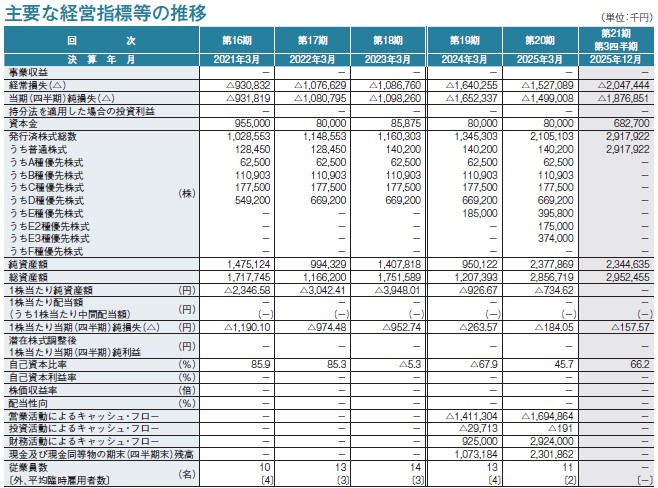 業績推移です。売上0が続いています。20期を迎えて赤字拡大で資金を集めては食いつぶしている状況です。一発当たればどんでん返しのバイオギャンブルらしい状況となっています。しかし、その一発あたる見通しもまだまだ先ですので、上場するのは構わないですが、上場時に参入する意味はかなり乏しいと言えそうです。
