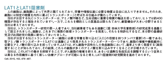 SLCトランスポーターをターゲットとした医薬品開発」となっています。杏林大学名誉教授の遠藤仁がこの分野での第一人者で、今までにないアプローチでの治療薬開発です。