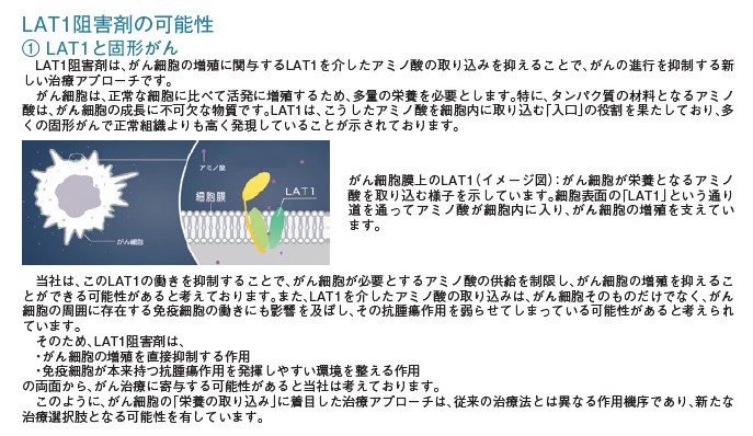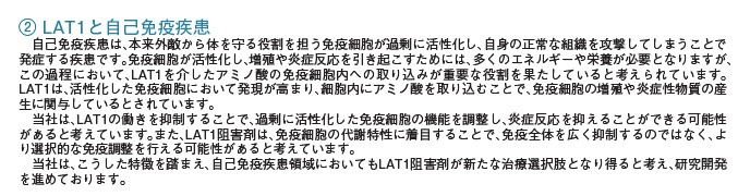 2つ目は自己免疫疾患に関してです。免疫細胞が過剰に活性化して、自身の正常な組織を攻撃することへもトランスポーターに作用して過剰活性化を抑えるなどを研究開発しています。仕組みはがん細胞への運び屋の抑制と同じではあるものの、このように別の疾患へのアプローチも可能になりそうです。