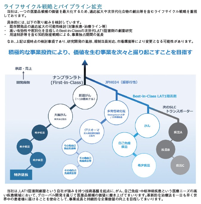 ライフサイクル戦略です。まずは今走っているパイプラインによる継続的な研究開発を進めて、同じような方法で他の疾患へも繋げていきたいという希望観測です。いかにもバイオらしい夢物語です。