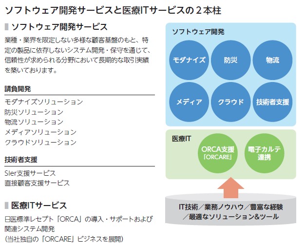 事業内容を端的にまとめています。「ソフトウェア開発」「医療IT」の2本柱となっていますが、ソフトウェア開発も防災系など、ややインフラや公共性の高いもののサポートが多そうです。事業に安定感はあるものの成長力があるとは言えないような事業スタイルと言えます。会社も40期超えで、スタンダード市場に上場ですので、地味系IPOの登場と言っても良いでしょう。普段なら嫌われますが、今のIPO地合いだと成長期待より堅調なタイプのほうがむしろ好かれるかもしれません。