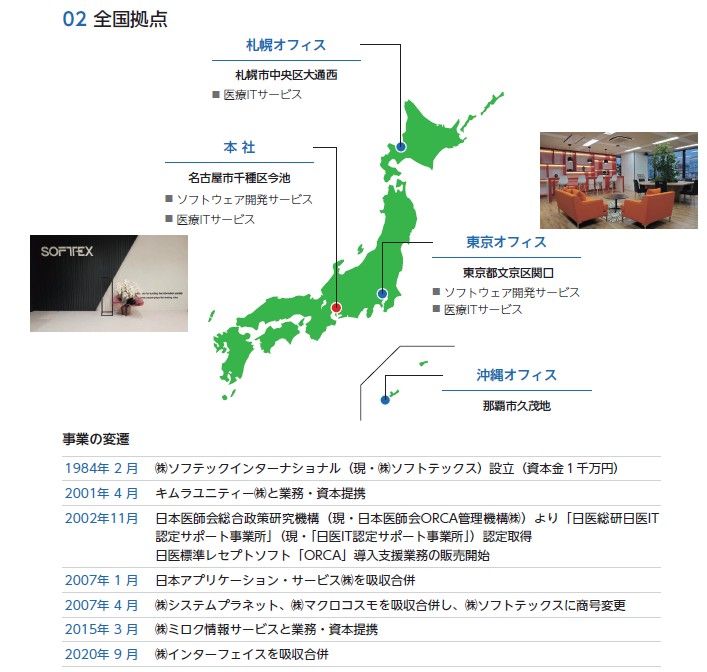 まず最初に全国に拠点がありますよ、ということを載せています。北海道から沖縄までオフィスがあることで全国の病院に医療ITを導入すると同時に、ちゃんとサポートもできる体制を整えています。このような安心感が堅実に受け入れられるところでしょうか?特に医療系DXは先進的であるよりも、ちゃんと効率よくサポートしてくれる、困ったときに対応してくれるというのが重要に感じます。