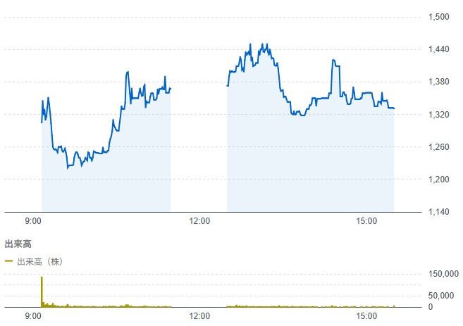 初値は1,290円でした。結果的に特に驚きもない想定範囲内で、ちゃんと微プラススタートとなってくれました。初値が付いたあとに伸びるかな?というところで一旦振り落としの下げが入っているのは、IPOの初日らしい神経質な需給戦を感じさせますね。地方市場で売買が少ないために、こういった荒れた動きは対応が難しいかも知れません。