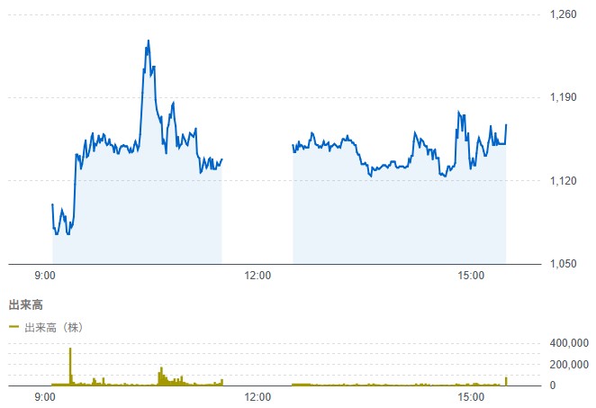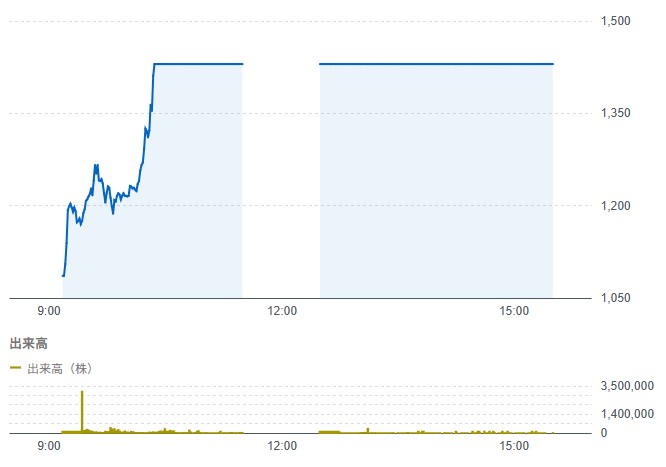 激しい動きとなったパワーエックス。初値は1,130円で公募割れでした。引受価格1,128円よりは少し上で付いていますが、ほぼ引受価格です。その後、安値では1,060円まで下げたものの前場のうちに一気に買われてストップ高となりました。そのまま1,430円で終値を迎えています。結局、初日のうちに初値予想に近いところまで力を見せたと言えますね。
