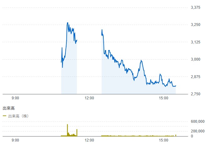 初値は2,980円となり、初値で頑張ったのはこちらでした。小型xSBI証券で需給面で初値から参戦しやすいと感じ取られたと言えそうです。当方は直前予想で下げましたが、逆にすべきでしたね。なお、心理的な壁になる2,775円はすでに超えていて、そういう事を気にせずIPOセカンダリーで勝負するならという戦いが演じられましたが、高値で3,325円まで行ったものの、下がり始める動きも早く、結局、終値は初値よりも安い2,810円で終えています。