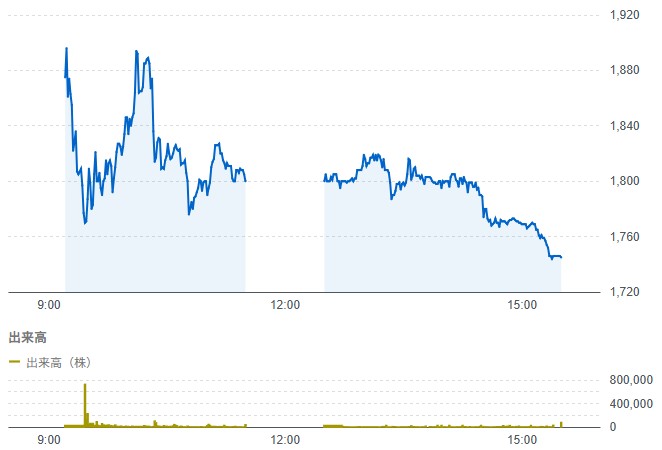 こちらの初値は残念ながら更に弱く微増の1,875円スタートとなりました。公開価格から125円高(+7%程度)でのスタートです。規模感なども考えると、この程度のスタートは予想されるところでしたが、弱く始まったせいか、上場してからすぐに初日で公開価格割れもあるならこちらという状況でした(昨日の直前予想で少し言及しています)。