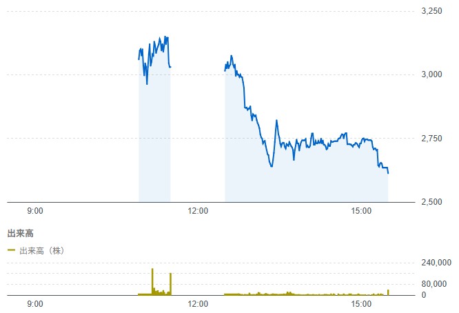 初値は3,200円と久しぶりに1.5倍以上となる上昇となりました。吸収金額5億レベルの小粒IPOでしたので、本来の地合いであればこの程度で始まってもおかしくはないので、本当に久しぶりに昔のIPOらしさという初値でした。ここまで初値が上昇すると需給戦で売り枯れを狙って更に高騰しないと厳しいですが、それが今回は来ず残念な初値天井となっています。