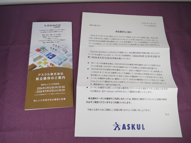 優待が利用可能になるのは2月12日からで5月12日まで約3ヶ月の利用期間があります。アスクルはシステム障害で新規注文など止まっていましたが、ようやく復帰して再び株主優待も使えるようになります。前回のクーポン券が使えなかった方にも今回再度使えるように案外が来ているようですね。