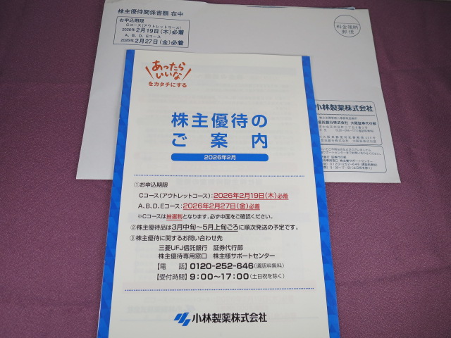小林製薬(4967)の株主優待案内が到着しました。