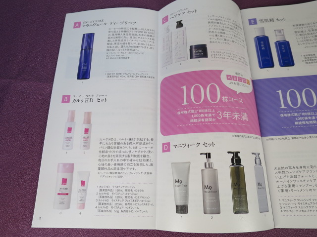 3年以上の保有で選べる商品が4つから8つまで増えます。化粧品系、スキンケア、ヘアケア系が多いです。なお、1000株になると高級商品のラインナップになりますが、我が家は「カルテHDセット」が1つ手に入ればよいので、とりあえずは100株3年未満で毎回頂いています。
