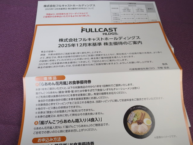 フルキャストホールディングス(4848)の株主優待案内が到着しました。