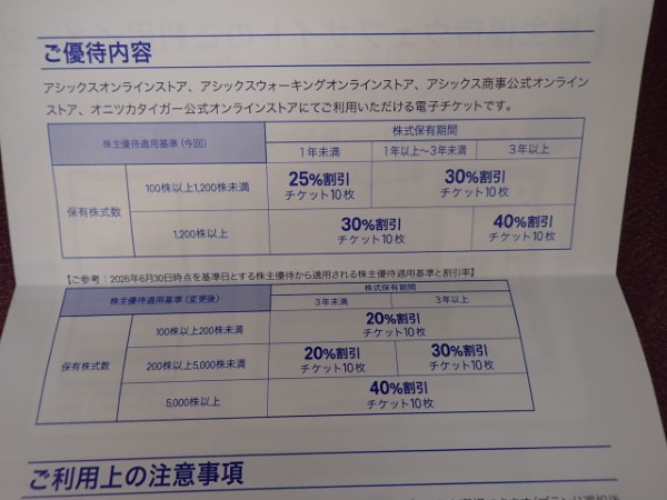 100株以上保有で1年未満だと25%割引券になります。長期で割引率が上がりますが、次回から変更点もあります。