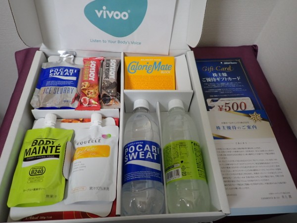 昨年も自宅で手軽に検尿して健康管理できそうなvivooが入っていて試そうかと思っていましたが、結局やらずでした。今年も入っていますが、こういうのってアプリで新規登録など面倒なので結局、優待で貰っても使うことはなさそうです。500円OFFのクーポン券もいつも使っていません。カロリーメイトとかドラッグストアで買ったほうが公式通販より安いという状態を何とかしたほうが良いと感じます。