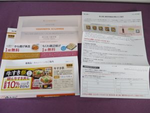 今回は吉野家で唐揚げ一個無料クーポン、はなまるうどんで竹輪一つクーポンが入っていました。こちらは2025年12月までと1ヶ月程度しか期限がないので、良いタイミンがあれば使いたいと思います。