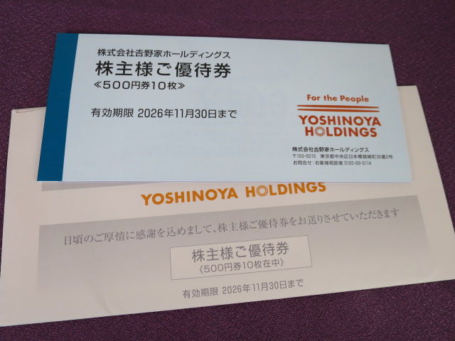 優待券は約1年の有効期限です。年2回優待ですと半年期限が多いですので、余裕を持って使える吉野家の優待はオススメです。