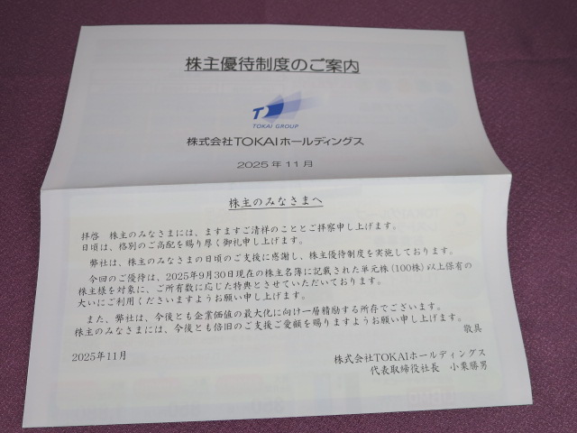 TOKAIホールディングス(3167)の株主優待案内が到着しました。