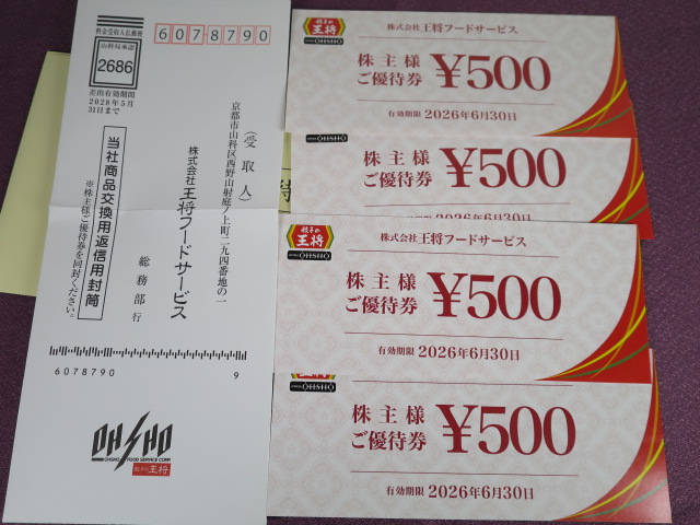 王将はまだまだお値ごろ感がありますので、2,000円分あれば2人分のランチ代になります。それが100株保有で年2回来ますので、王将でたまに食べたいという方には本当に丁度よい量の優待券です。我が家も徒歩圏に王将があるので、うまく利用させていただいています。