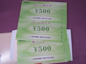 100株以上で1,000円分の優待券です。3年以上保有で500券1枚追加になります。
