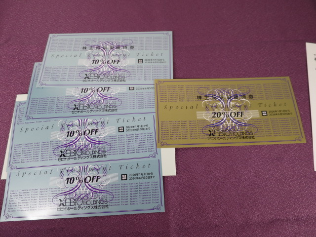 年2回、毎回同じ内容が届きます。20%オフは使えますが、10%オフはややゴミ扱いかもしれません。2種類の割引を優待で用意してしまうと、どうしても10%の方の価値が下がってしまうので、ここの優待だけはいつも改善して欲しいなぁと思っています。「10%オフ4枚→20%1枚」に変えるだけで、優待内容の良さから株も買われるのでは?と思うのは私だけでしょうか?