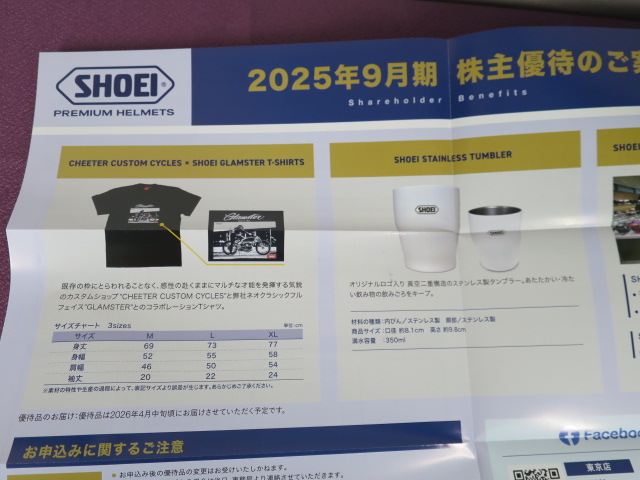 ノベルティグッズはTシャツかタンブラーから選択です。Tシャツはパジャマとしても使えますし、良いのではないでしょうか?割引券もバイクに乗る人はヘルメットとか安く買えるのでありだと思います。私もバイク乗っていた時は「SHOEI」のヘルメットでした。ARAIは苦手でした。